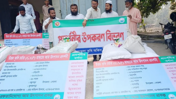 আজ বুধবার সকালে কৃষি সম্প্রসারণ অধিদপ্তরের উত্তম কৃষিচর্চার মাধ্যমে আম উৎপাদন প্রদর্শনীর ৬জন আমচাষির মধ্যে এসব উপকরণ বিতরণ করা হয়। উপকরণ বিতরণ করেন কৃষি কর্মকর্তা কৃষিবিদ মামুনুর রশিদ।